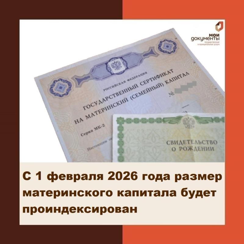 ✔ С 1 февраля 2026 года произойдет индексация материнского капитала на 5,6%. После индексации размер МСК увеличится до 728 921,9 руб. на первого ребенка. За второго ребенка семья получит 234 321,3 руб. или до 963 243,2 руб., если ранее не получила выплату на первенца.